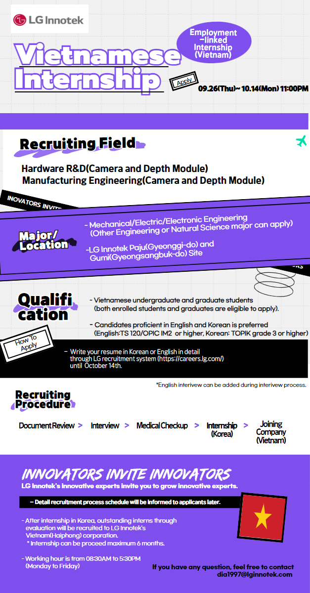 - [취업 및 진로] ’24년 LG이노텍-베트남 유학생 인턴십 채용 공고